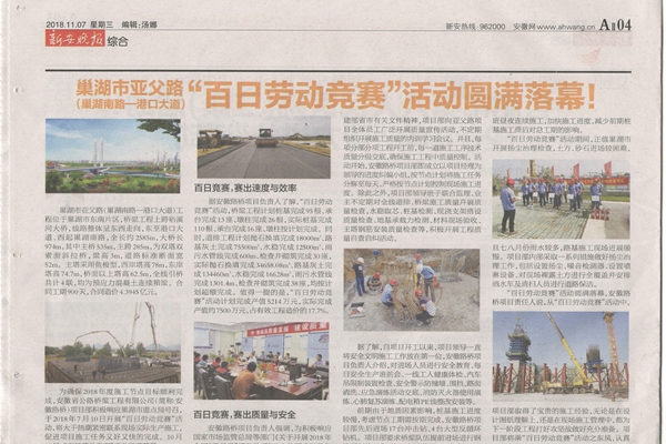 11月7日,《新安晚報環(huán)湖新聞》專題報道了公司承建的巢湖亞父路裕溪河特大橋“百日勞動競賽”活動。