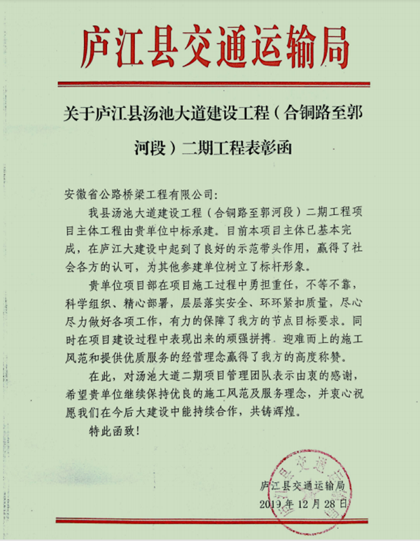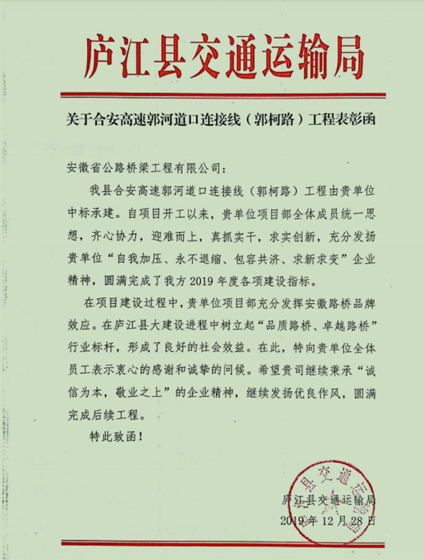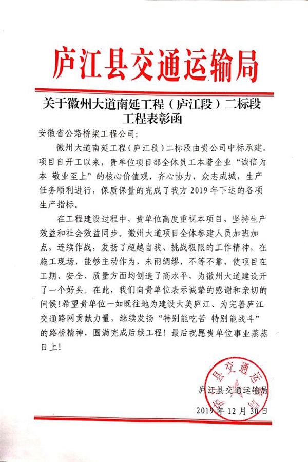 近日,公司收到廬江縣交通運(yùn)輸局寄來的表揚(yáng)信,對徽州大道南延工程(廬江段)二標(biāo)段、湯池大道建設(shè)工程(合銅路至郭河段)二期及合安高速郭河道口連接線(郭柯路)工程等三個(gè)項(xiàng)目積極克服各類困難,高標(biāo)準(zhǔn)、嚴(yán)要求推進(jìn)施工生產(chǎn)給予表揚(yáng)和感謝。