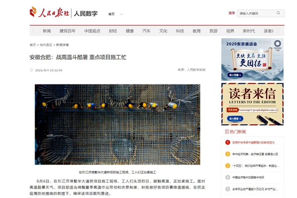 8月6日,《人民日報》數(shù)字安徽以《安徽合肥:戰(zhàn)高溫斗酷暑 重點(diǎn)項(xiàng)目施工忙》為題報道了公司承建的引江濟(jì)淮繁華大道橋項(xiàng)目建設(shè)情況。