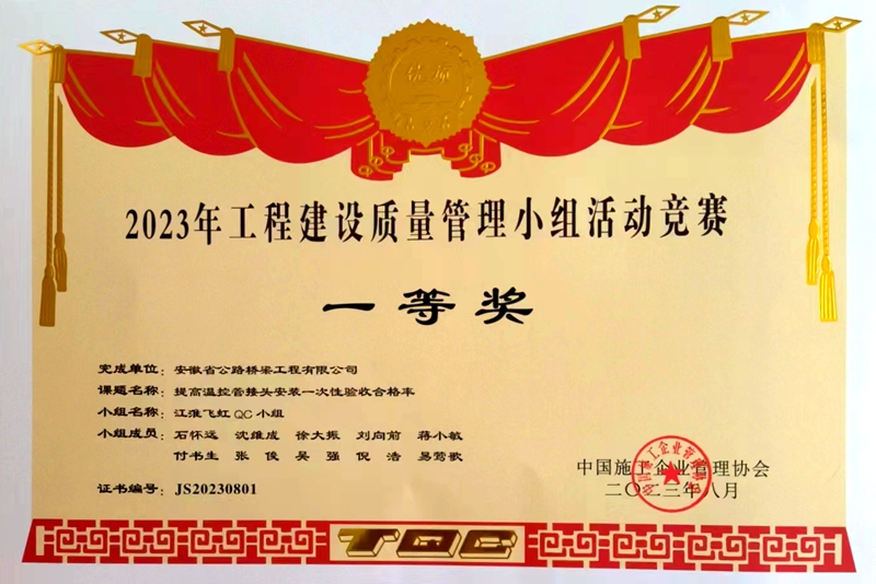 8月11日,中國施工企業(yè)管理協(xié)會(huì)“2023年(首屆)工程建設(shè)行業(yè)質(zhì)量管理小組活動(dòng)高質(zhì)量發(fā)展大會(huì)”在山西太原順利閉幕。會(huì)議對(duì)各地區(qū)及行業(yè)協(xié)會(huì)推薦的1468個(gè)優(yōu)秀QC成果進(jìn)行了集中發(fā)布,其中橋梁分公司申報(bào)的QC成果《提高溫控管接頭安裝一次性驗(yàn)收合格率》榮獲一等獎(jiǎng),市政分公司申報(bào)的QC成果《提高地下車庫地坪施工合格率》《研制超大仿石道板磚鋪裝機(jī)》榮獲二等獎(jiǎng)。