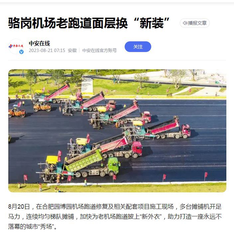 8月20日,公司承建的駱崗中央公園合肥園博園機(jī)場(chǎng)跑道修復(fù)工程項(xiàng)目進(jìn)行瀝青攤鋪施工,中安在線、合肥日?qǐng)?bào)、江淮晨報(bào)和合肥晚報(bào)等多家省市級(jí)媒體聚焦報(bào)道。