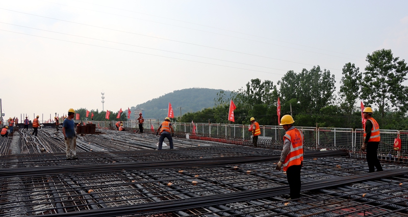 小蜀山東路上跨橋是項(xiàng)目控制性施工節(jié)點(diǎn)。施工現(xiàn)場(chǎng)車流量大、重型貨車多且新建道路與既有道路存在較大高差導(dǎo)致交通組織極其困難,小蜀山東路南側(cè)房屋未拆遷,現(xiàn)場(chǎng)幾乎無(wú)施工作業(yè)面。面對(duì)重重困難,為保障此節(jié)點(diǎn)順利完成,項(xiàng)目部提前謀劃,多次組織相關(guān)單位召開(kāi)方案研討會(huì),優(yōu)化施工方案,并通過(guò)科學(xué)組織施工,前后組織十余次交通導(dǎo)改,巧妙利用南幅新建橋梁作為施工便道和作業(yè)面,歷時(shí)45天順利實(shí)現(xiàn)全線首座上跨橋雙幅貫通。