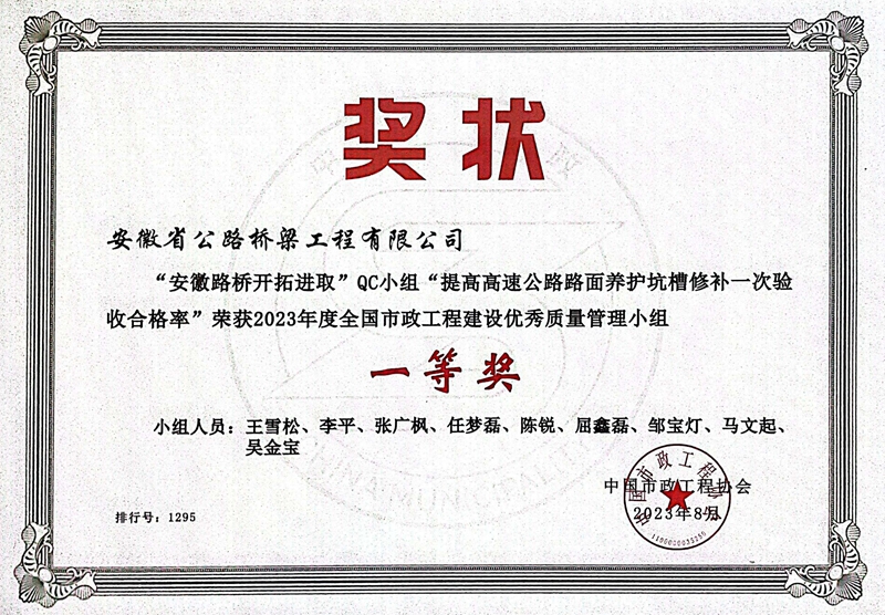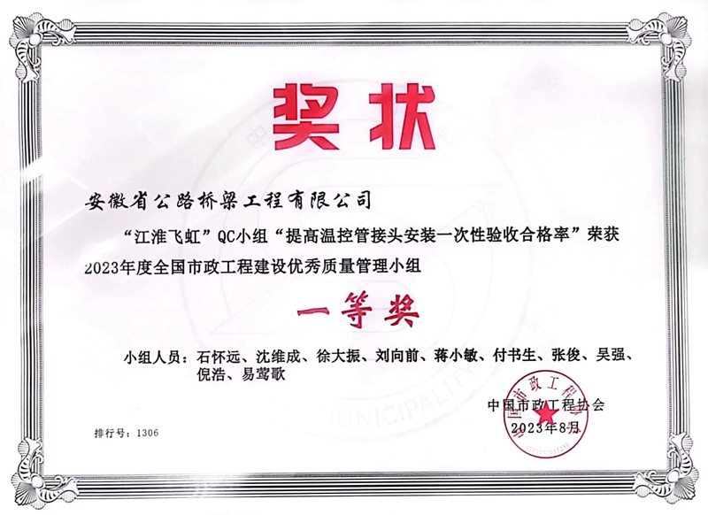 11月10日,中國市政工程協(xié)會(huì)“2023年全國市政工程建設(shè)質(zhì)量管理小組培訓(xùn)交流會(huì)”在廣東佛山順利召開,會(huì)上頒發(fā)了2023年度全國市政工程建設(shè)優(yōu)秀質(zhì)量管理小組各分組成績排名第一的QC成果證書,公司3項(xiàng)成果名列其中。