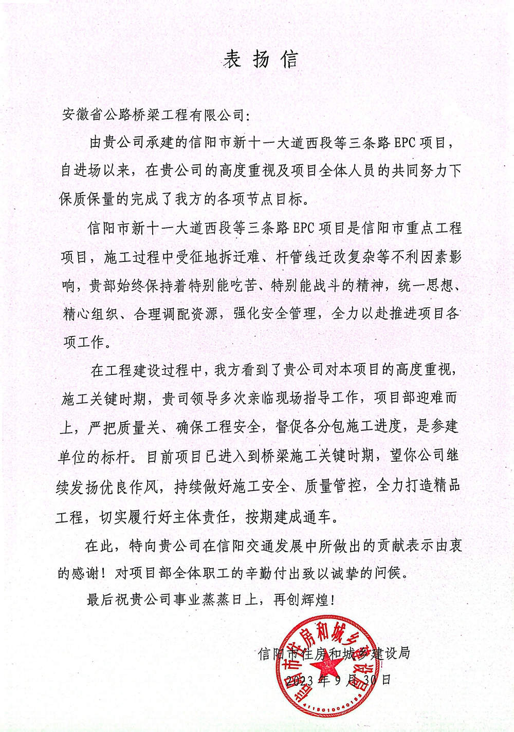 信陽市住房和城鄉(xiāng)建設(shè)局來信指出,信陽新十一大道項目在施工過程中克服征地拆遷難、桿管線遷改復(fù)雜等不利因素影響,始終發(fā)揚“特別能吃苦、特別能戰(zhàn)斗”的企業(yè)作風(fēng),嚴把質(zhì)量關(guān)、安全關(guān),高質(zhì)高效推進項目建設(shè),為信陽交通發(fā)展做出了突出貢獻。