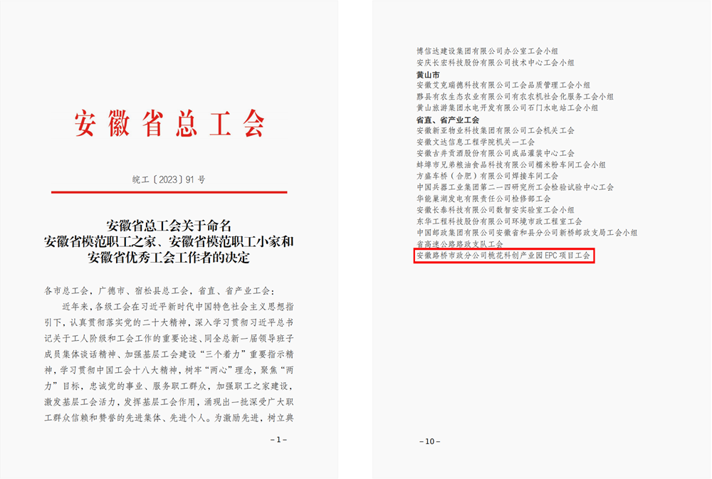 桃花科創(chuàng)產(chǎn)業(yè)園EPC項目工會榮獲“安徽省模范職工小家”稱號