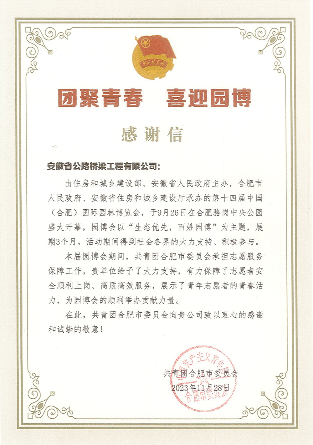 2023年5月至9月,公司集聚優(yōu)勢資源,承建園博園機場跑道修復(fù)及相關(guān)配套項目,高效完成各項施工任務(wù),為老機場跑道換上“新衣”,助力園博盛會精彩開幕。同時,在園博會期間,積極響應(yīng)合肥團市委號召,組織招募青年志愿者,為園博會期間的各項活動做好服務(wù)保障工作,展現(xiàn)了新時期安徽路橋青年志愿者的風(fēng)采。