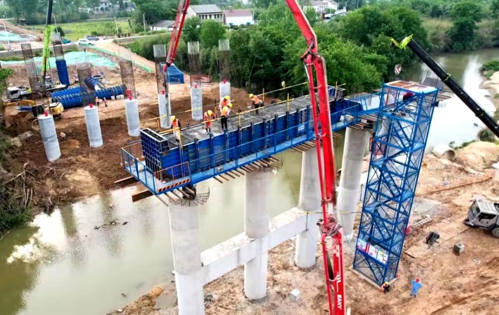 S22天天高速YQB2標施工現(xiàn)場一片繁忙,5個施工班組、10余套大型機械、100名施工工人正在施工作業(yè),上立柱混凝土澆筑、蓋梁現(xiàn)澆等多個工序同步進行,爭取在在汛期來臨前撤離河道,為下一步梁板架設創(chuàng)造有利條件。