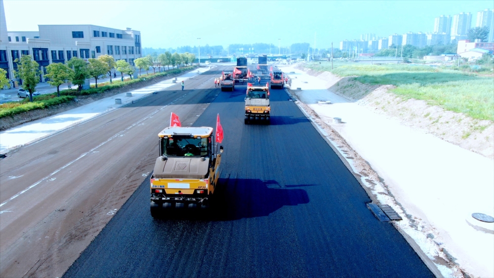 5月3日,在霍邱縣蓼東大道施工現(xiàn)場(chǎng),工人們正進(jìn)行安陽(yáng)山路至五岳路段下面層瀝青攤鋪工作,一輛輛運(yùn)料車、攤鋪機(jī)、壓路機(jī)來(lái)回穿梭。