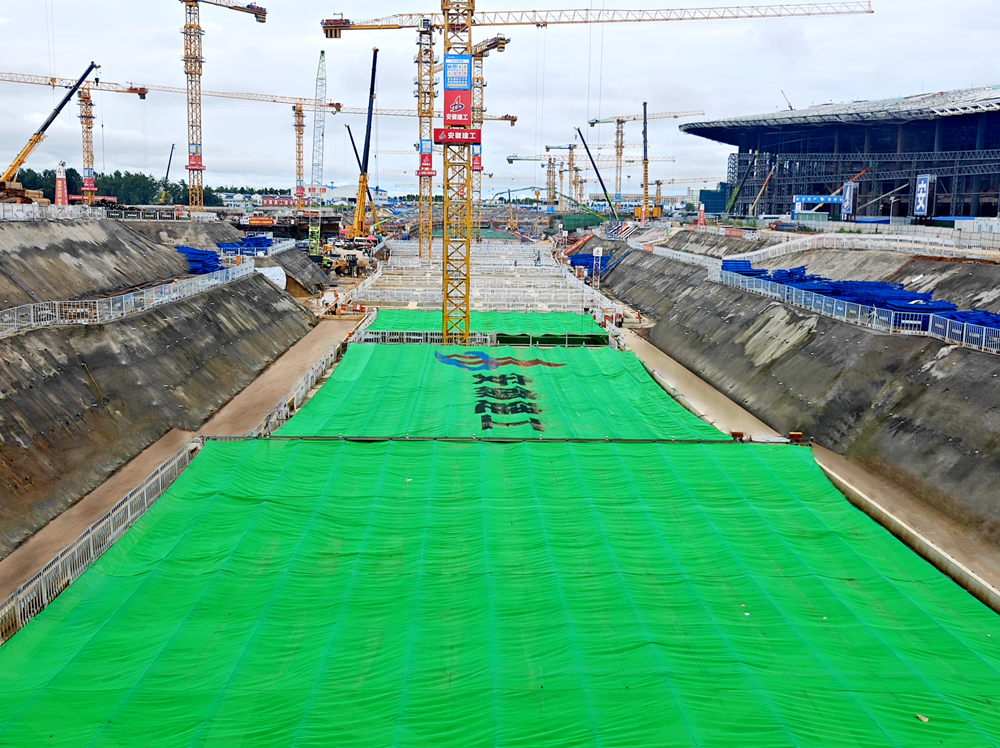灼灼烈日,人們出行會(huì)打起遮陽(yáng)傘躲避烈日與紫外線(xiàn)侵襲。近日,在合肥新橋機(jī)場(chǎng)綜合交通中心項(xiàng)目現(xiàn)場(chǎng),一項(xiàng)防暑“神器”——大跨度、智能化防塵“天幕”系統(tǒng)投入使用,如同給項(xiàng)目基坑罩上了一把“綠色遮陽(yáng)傘”。