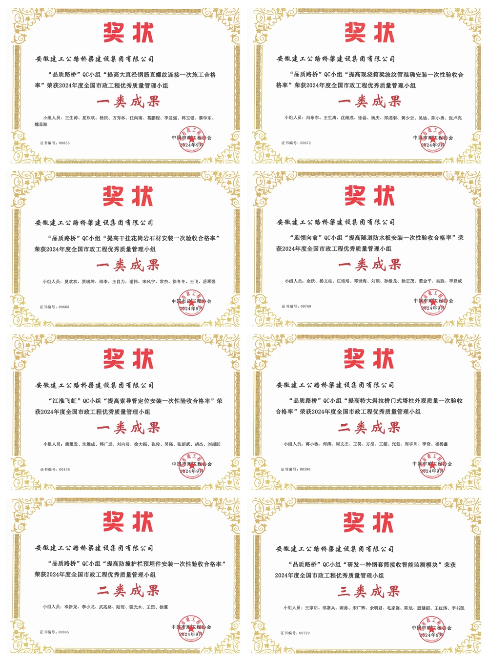 近日,中國市政工程協(xié)會正式公布了2024年度全國市政工程優(yōu)秀質(zhì)量管理小組名單,公司8項QC成果脫穎而出,榮獲全國QC成果一等獎5項、二等獎2項、三等獎1項。
