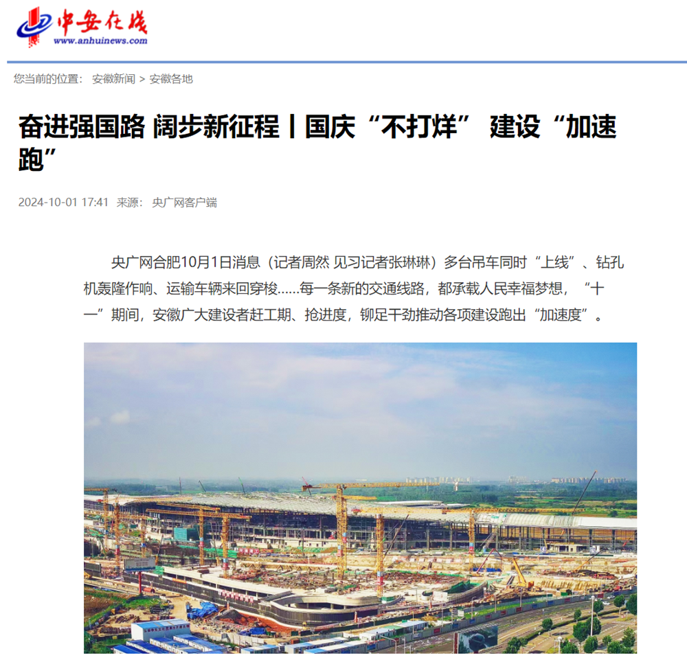 國慶假期,公司所屬各重點(diǎn)項(xiàng)目“不打烊”,推動(dòng)項(xiàng)目建設(shè)“加速跑”,受到中央廣播電視總臺(tái)、新華社、央廣網(wǎng)、安徽衛(wèi)視、中安在線等國家和省部級(jí)主流媒體聚焦報(bào)道。