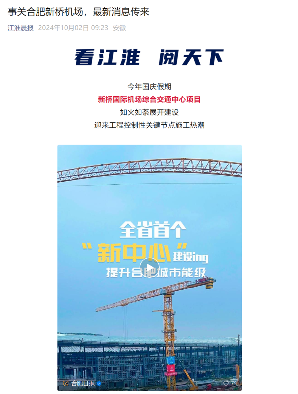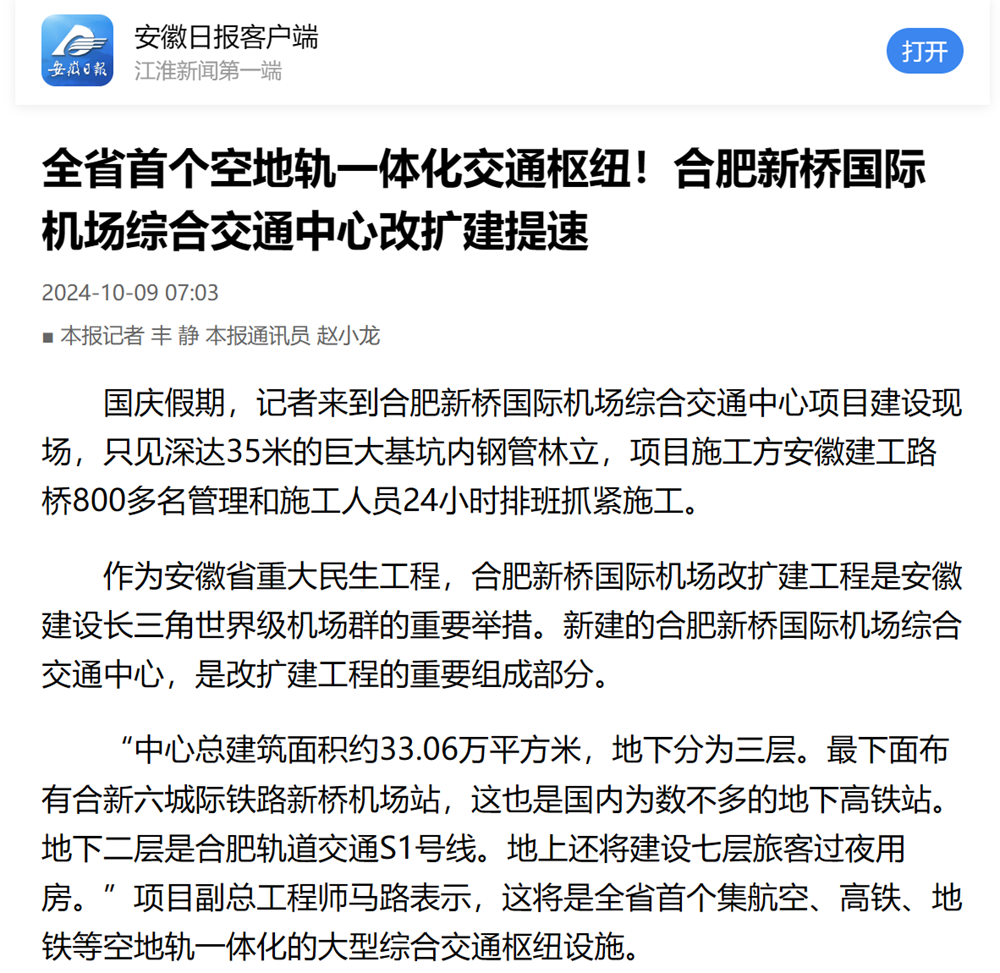 國慶前后,安徽新聞聯(lián)播、安徽日報(bào)、江淮晨報(bào)等多家省級主流媒體紛紛聚焦公司承建的涇青高速04標(biāo)、徐淮阜高速淮北段、合肥新橋國際機(jī)場綜合交通中心等重點(diǎn)項(xiàng)目建設(shè)情況進(jìn)行報(bào)道。