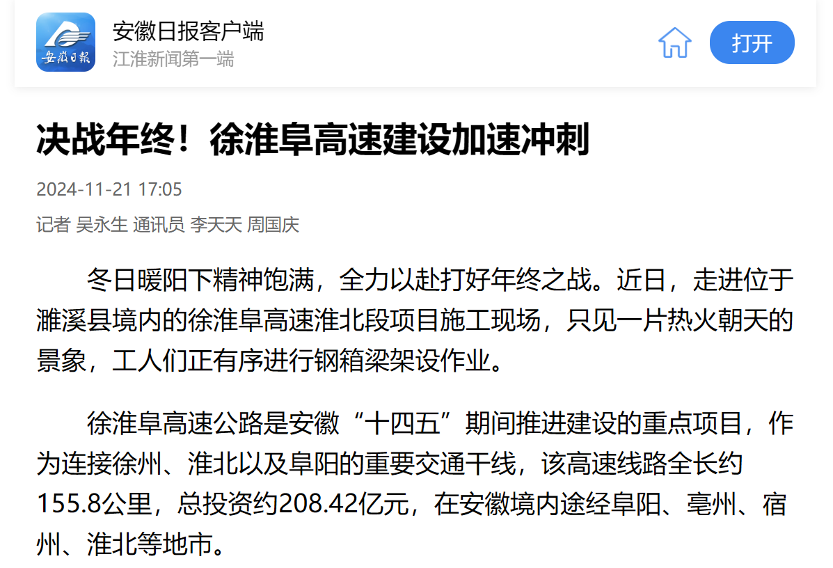 【名媒聚焦】安徽日報客戶端、學習強國、淮北日報:決戰(zhàn)年終!徐淮阜高速建設(shè)加速沖刺