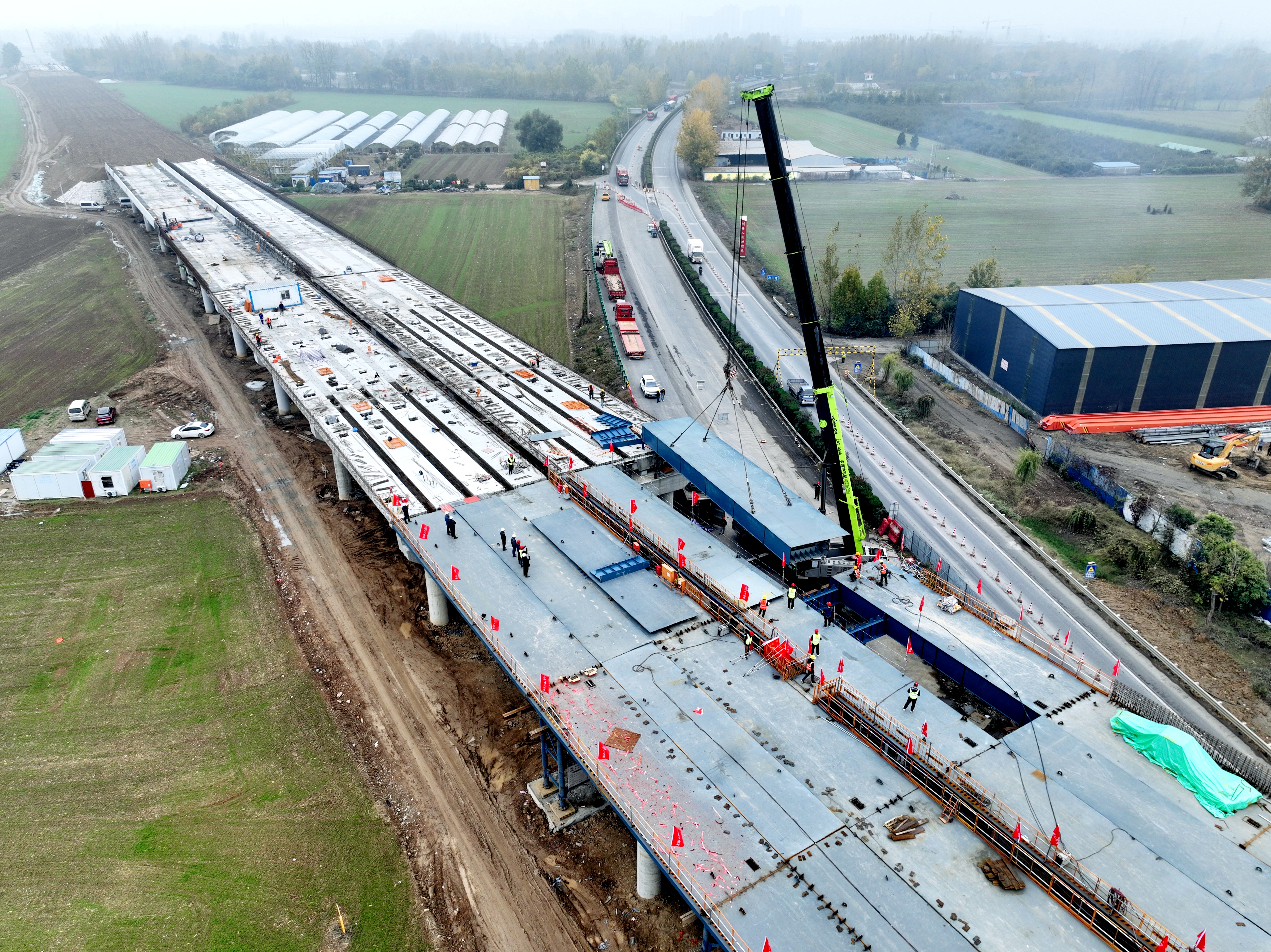 記者在現(xiàn)場了解到,11月以來,淮北段項目實現(xiàn)多個重要節(jié)點突破,先后完成K71+462車行天橋、K46+814.5大廟溝橋、K40+647.6洪堿河大橋3座橋梁下部結(jié)構(gòu)施工,上跨臥龍湖煤礦鐵路橋、K43+681規(guī)劃G237分離立交橋、K42+794中橋三座橋梁橋面系及附屬工程施工,項目重點控制性工程K50+162.5跨S303分離立交橋鋼箱梁的全部架設(shè),目前正全力沖刺確保11月底前完成全線橋梁下部結(jié)構(gòu)施工的節(jié)點目標。