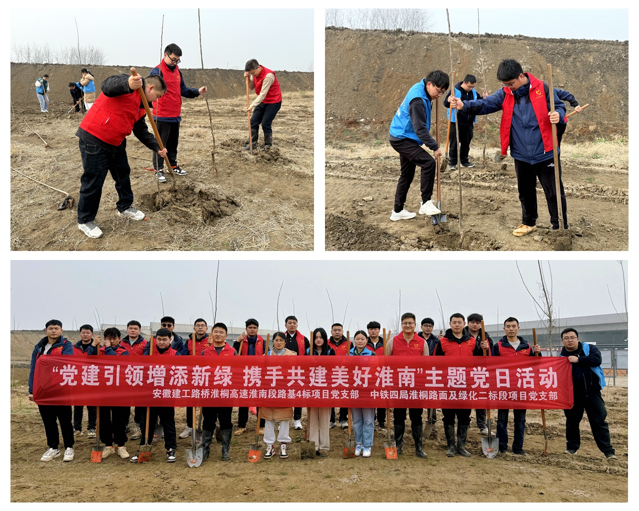 淮桐高速淮南段路基4標(biāo)項(xiàng)目黨支部聯(lián)合中鐵四局淮桐路面及綠化二標(biāo)黨支部在李山互通聯(lián)合開(kāi)展“黨建引領(lǐng)增添新綠,攜手共建美好淮南”主題黨日活動(dòng)。