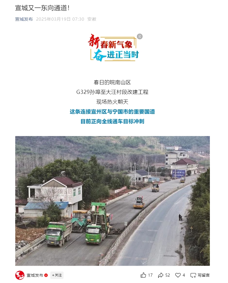 春日的皖南山區(qū),G329孫埠至大汪村段改建工程現(xiàn)場熱火朝天。攤鋪機、壓路機與運輸車輛轟鳴交織,滾燙的瀝青蒸騰起陣陣白霧。這條連接宣州區(qū)與寧國市的重要國道,目前正向全線通車目標沖刺。作為融入長三角的重要通道,項目建成后,宣城至寧國通行時間將大大縮短,惠及沿線10萬余群眾。