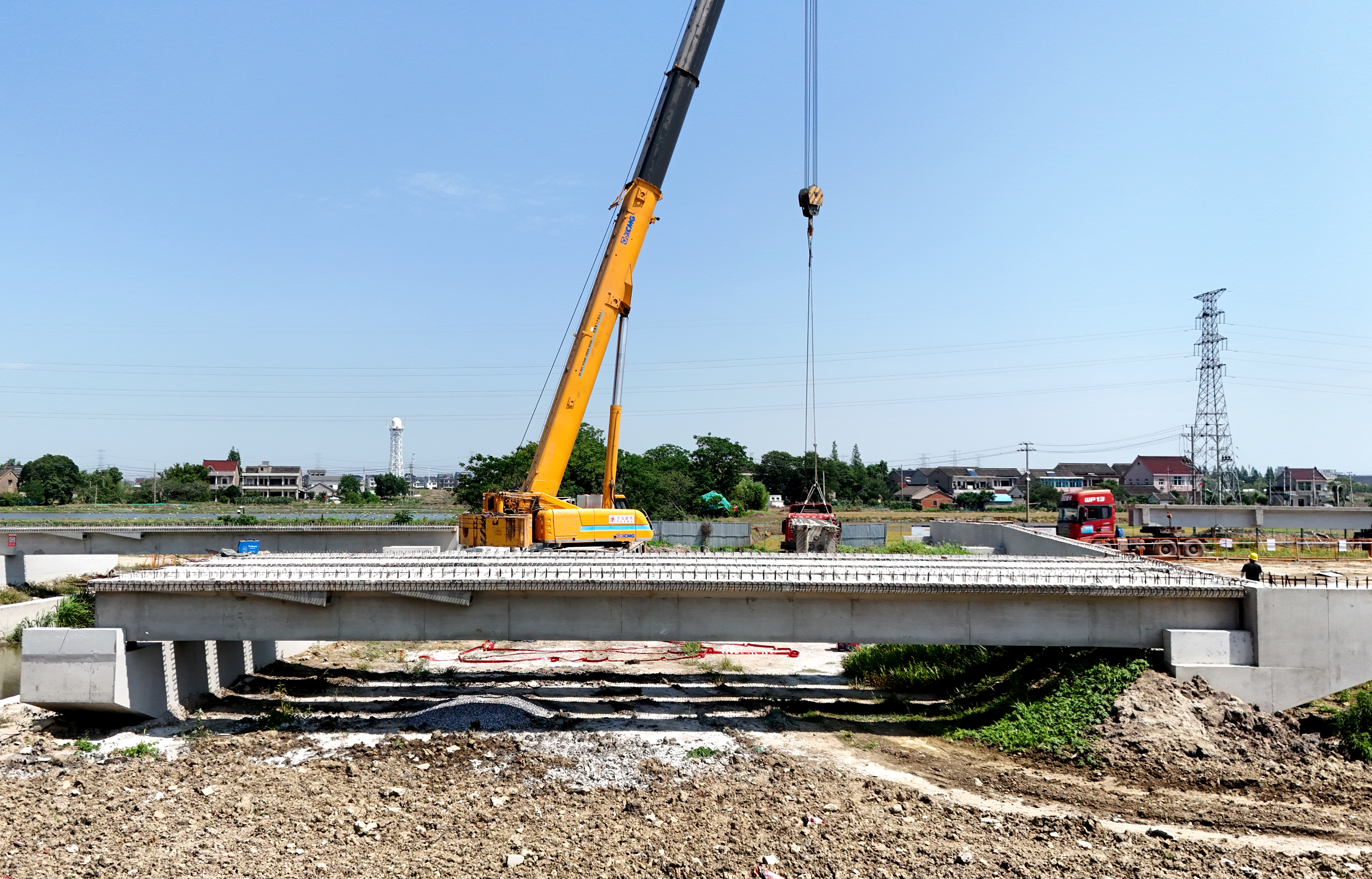 此次架設的T梁重約40噸。從運輸路線勘察到吊裝設備調試,項目部實施“預警車引導+交通協(xié)管”雙重保障措施,并制定專項施工方案,開展專項技術交底、模擬演練,確保了首片T梁的安全運輸及精準安裝。