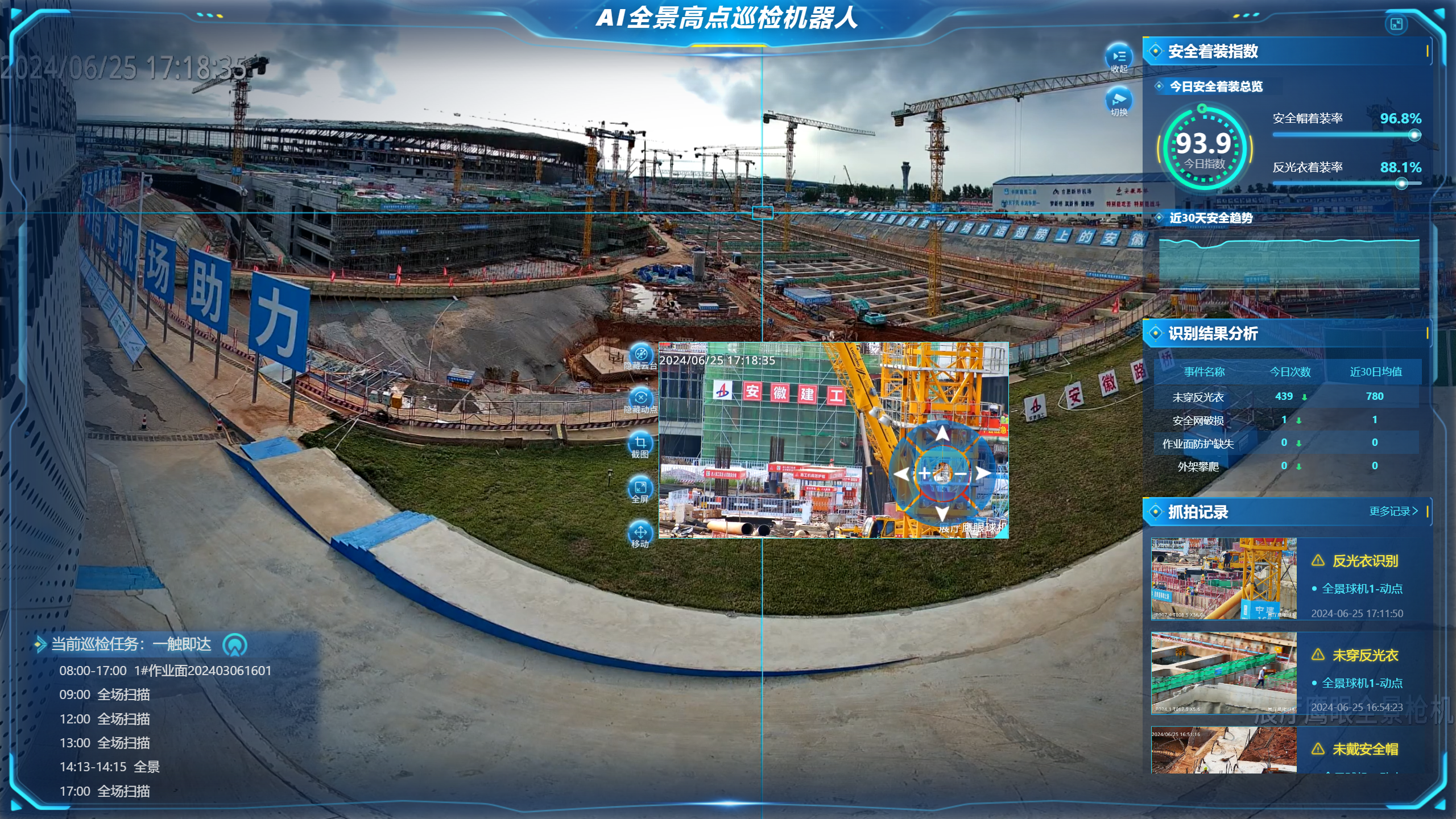 AI高點巡檢機器人的登場,革新了傳統(tǒng)巡檢模式。通過運用錐面拼接技術(shù),將傳統(tǒng)視頻監(jiān)控的視野短板一掃而空。自動巡檢時,動點攝像頭精準捕捉人員違規(guī)行為,對安全隱患實時抓拍記錄。結(jié)合AI算法,切實解決了人工巡檢的耗人耗時難題,同時隱患識別準確率提高至98%,單項目巡檢成本銳減50%~70%,全程保障了“零事故”作業(yè)。