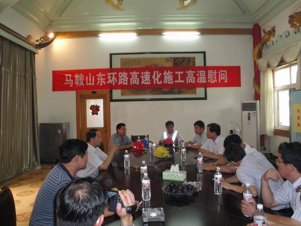 在我項目部大廳,王書記首先發(fā)表了熱情洋溢的講話,高度贊揚了我項目勇戰(zhàn)高溫、搶抓工期、誓保質(zhì)量的大無畏施工精神。隨后,王書記又送上了慰問信,并與員工代表們一一握手,發(fā)放慰問金、慰問品。最后,在項目部會議室,王書記一行與蘇指揮長,蔡主任、江主任,總監(jiān)代表郭亮以及我部項目經(jīng)理冷峰等進行座談,詳細(xì)了解了我南環(huán)02標(biāo)項目的整體情況以及近期施工的進展情況,希望我部繼續(xù)發(fā)揚安徽省路橋公司攻堅克難的優(yōu)良傳統(tǒng),保質(zhì)保量的如期完成東環(huán)02標(biāo)項目建設(shè)任務(wù)。