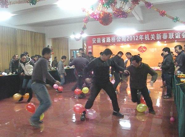 四支代表隊(duì)分別在綁腳聯(lián)體賽跑、集體造句、搶椅子、瞎子擊鼓、辯真假、踩氣球等游戲環(huán)節(jié)展開了激烈競爭,現(xiàn)場掌聲連連,笑聲、歡呼聲此起彼伏,氣氛十分熱烈。最終飛龍代表隊(duì)在最后一個(gè)游戲環(huán)節(jié)力壓奔馳隊(duì)獲得一等獎(jiǎng)。在游戲中間的節(jié)目表演環(huán)節(jié),各隊(duì)多才多藝的隊(duì)員們爭相登臺(tái)表演,有人唱歌、有人舞蹈、還有人一秀太極拳,競賽的節(jié)目使聯(lián)歡會(huì)高潮迭起、亮點(diǎn)紛呈。聯(lián)歡會(huì)上還安排了讓人激動(dòng)的抽獎(jiǎng)活動(dòng)。