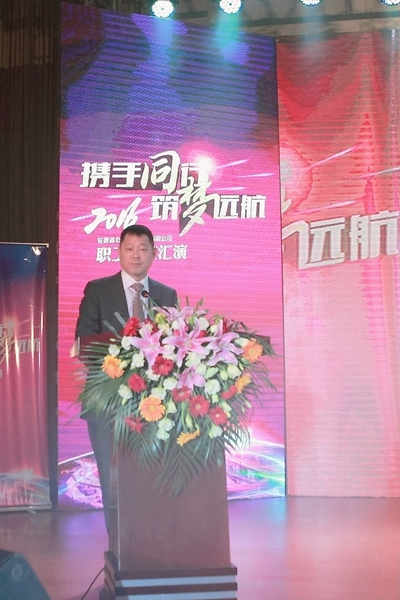 演出現(xiàn)場華燈璀璨,座無虛席,氣氛喜慶熱烈。匯演正式開始前,公司董事長、總經(jīng)理孫學(xué)軍發(fā)表了熱情洋溢的致辭。他首先代表公司向蒞臨現(xiàn)場的嘉賓及長期以來堅持在公司各個崗位的員工及家屬,致以誠摯的問候和新春的美好祝愿,向默默奉獻(xiàn),為路橋事業(yè)奠基的前輩們致以崇高的敬意。指出,2015年,是宏觀形勢錯綜復(fù)雜的一年,也是公司成績斐然的一年,在建工集團(tuán)的正確領(lǐng)導(dǎo)下,全體員工凝心聚力,開拓奮進(jìn),取得了驕人的業(yè)績。充滿機(jī)遇和挑戰(zhàn)的“十三五”已經(jīng)開局,全體路橋人要秉承優(yōu)良傳統(tǒng),凝心聚力,同舟共濟(jì),譜寫安徽路橋新的輝煌。