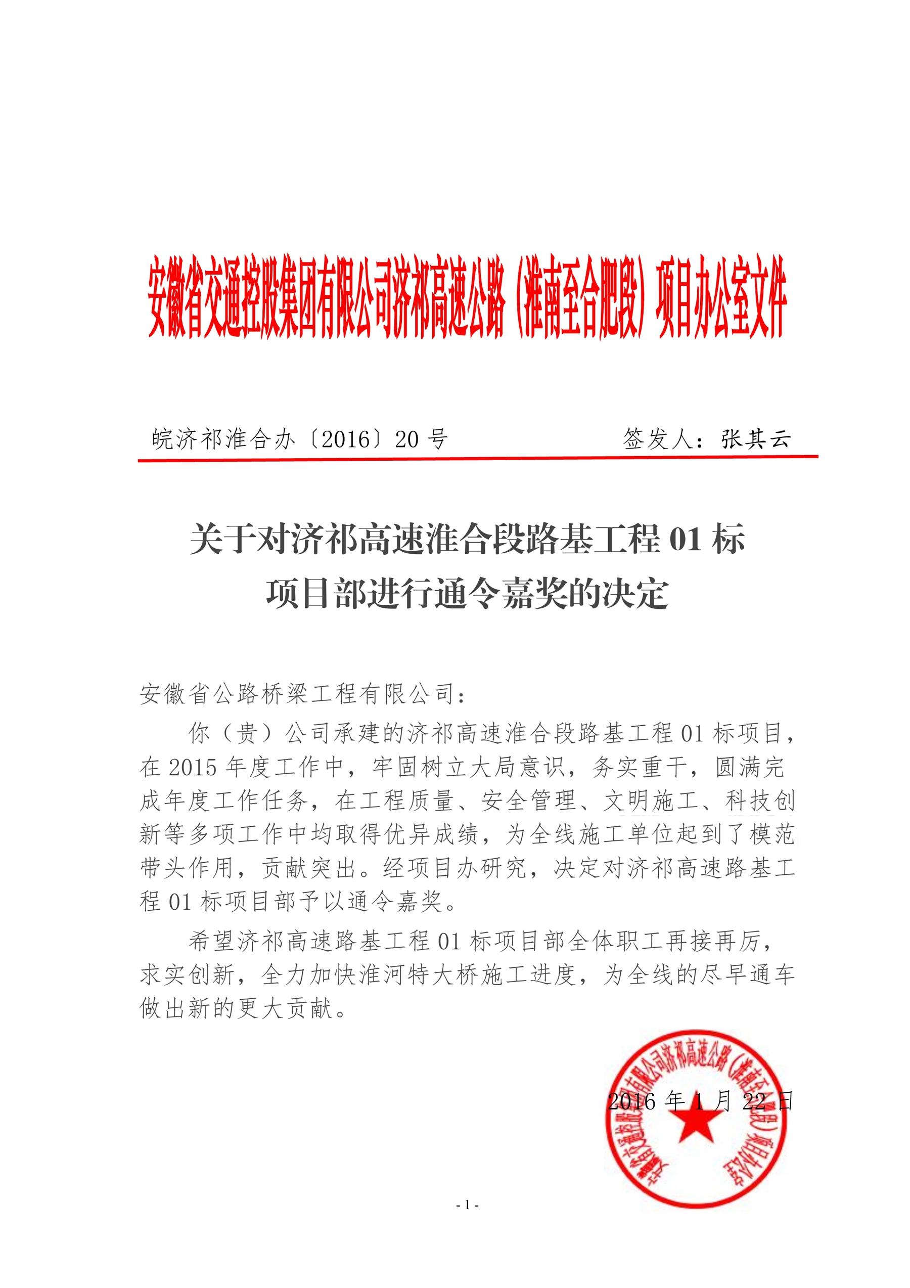 1月22日,安徽省交通控股集團(tuán)發(fā)來嘉獎令,對公司承建的濟(jì)祁高速淮合段路基工程01 標(biāo)項(xiàng)目通令嘉獎。