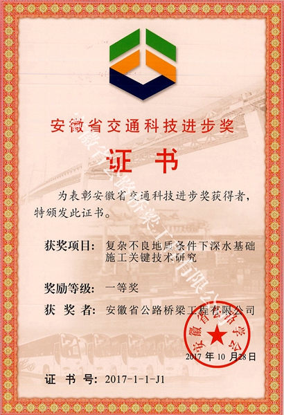 《復(fù)雜不良地質(zhì)條件下深水基礎(chǔ)施工關(guān)鍵技術(shù)研究》是以濟(jì)祁淮河特大橋基礎(chǔ)施工為背景,深入研究了樁基施工到圍堰施工一體系成套基礎(chǔ)施工關(guān)鍵技術(shù),創(chuàng)新式的改進(jìn)結(jié)構(gòu)及施工工藝使得體系結(jié)構(gòu)受力合理。該施工技術(shù)及理論從實(shí)踐中總結(jié)得出,并在項(xiàng)目施工中成功驗(yàn)證。2017年7月,經(jīng)中國(guó)公路建設(shè)行業(yè)協(xié)會(huì)組織的專家鑒定,該技術(shù)成果達(dá)到國(guó)際先進(jìn)水平。《大曲率鋼橋面鋪裝雙層高粘SMA瀝青瑪蹄脂碎石施工技術(shù)》重點(diǎn)對(duì)大曲率鋼橋的安裝施工方法進(jìn)行了描述,同時(shí)橋面鋪裝施工首次采用基質(zhì)瀝青添加直投式RST高粘瀝青改性劑,采用特殊的礦料級(jí)配,結(jié)合靜態(tài)碾壓工藝,成功解決了鋼橋面變形性能導(dǎo)致的壓實(shí)度不易控制的難題,有效提高了施工質(zhì)量。2017年7月,經(jīng)專家鑒定,該技術(shù)成果達(dá)到國(guó)內(nèi)先進(jìn)水平。