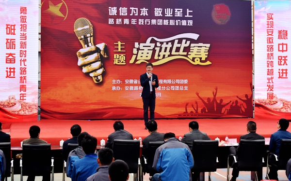 公司黨委書記、董事長(zhǎng)、總經(jīng)理孫學(xué)軍致開幕辭,他代表公司對(duì)蒞臨現(xiàn)場(chǎng)的嘉賓表示熱烈歡迎,向參賽選手及一線青年員工致以美好祝愿。孫總指出:“誠(chéng)信為本 敬業(yè)至上”是集團(tuán)公司企業(yè)文化的精髓和靈魂,廣大團(tuán)員青年要深刻領(lǐng)會(huì)集團(tuán)核心價(jià)值觀的精神實(shí)質(zhì),傳承路橋文化特色,立足工作實(shí)際,內(nèi)化于心,外化于行,充分展現(xiàn)新時(shí)代路橋人的精神面貌。孫總要求,全體路橋青年要深入學(xué)習(xí)貫徹黨的十九大精神,始終堅(jiān)持誠(chéng)信為本、敬業(yè)至上,用實(shí)際行動(dòng)為奮力開創(chuàng)安徽路橋轉(zhuǎn)型發(fā)展新局面貢獻(xiàn)力量。