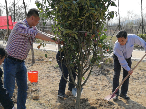 在植樹活動現(xiàn)場,信長星與項目負(fù)責(zé)人共同植下第一棵樹,同時給大家講解了一些植樹的技巧和注意事項。
