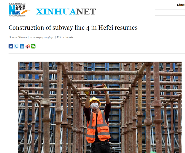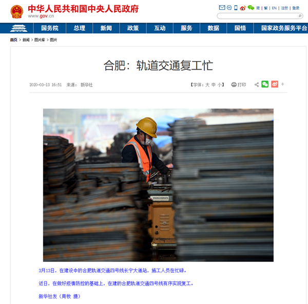 近日,中華人民共和國中央人民政府官方網(wǎng)站、新華社同時以《合肥軌道交通復(fù)工忙》為題,報道了公司承建的合肥軌道交通4號線長寧大道站復(fù)工復(fù)產(chǎn)情況,用8張圖片展現(xiàn)了現(xiàn)場全面復(fù)工復(fù)產(chǎn)后的施工場景。