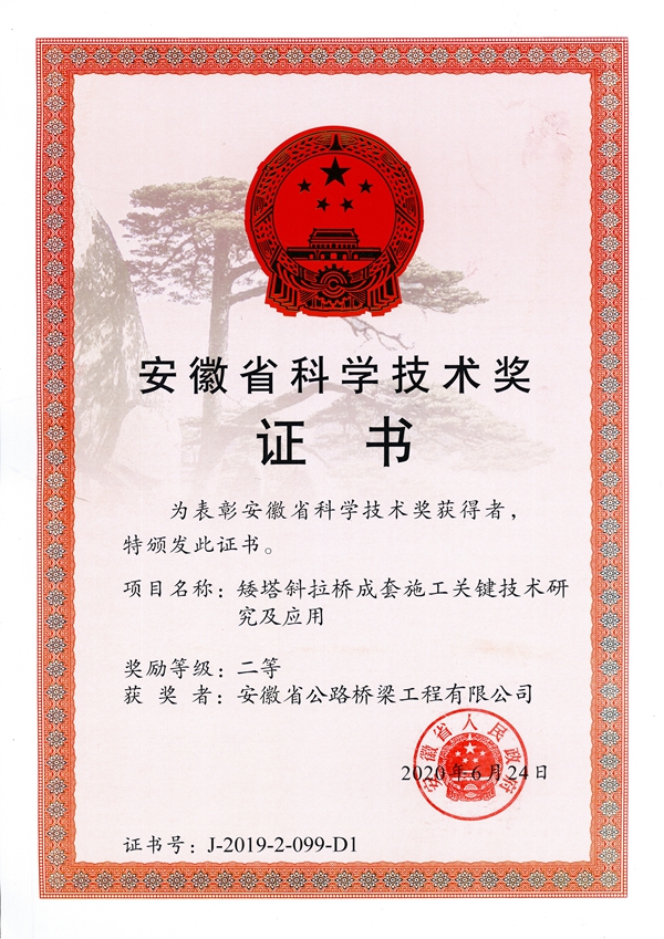 近期,公司主持申報(bào)的《矮塔斜拉橋成套施工關(guān)鍵技術(shù)研究及應(yīng)用》課題,通過層層篩選,榮獲“2019年度安徽省科學(xué)技術(shù)獎(jiǎng)二等獎(jiǎng)”。