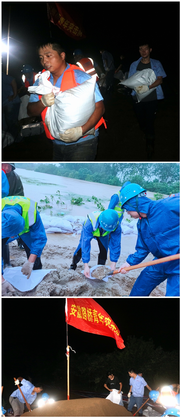 這群95后新員工剛到項(xiàng)目上工作沒有幾天,就面臨了一次“勞其筋骨”的大考。但面對困難,他們沒有退縮。 一些項(xiàng)目青年聞“汛”而動(dòng),自發(fā)組織青年志愿者、青年突擊隊(duì)奔赴前線,吹響青春集結(jié)號。在抗洪一線,他們肩扛手提,裝袋、搬運(yùn)、填筑,汗水浸透了衣服,實(shí)在干不動(dòng)了,席地而坐或杵著鐵鍬稍作休息,隨后繼續(xù)投入戰(zhàn)斗。在“青年突擊隊(duì)”紅旗的輝映下,他們與洪水搏擊,與險(xiǎn)情對戰(zhàn),團(tuán)結(jié)協(xié)作,筑起了一道道“青春堤壩”,阻擋了洪水肆虐的腳步,“后浪”搏擊洪災(zāi),有力地推進(jìn)了搶險(xiǎn)進(jìn)度。