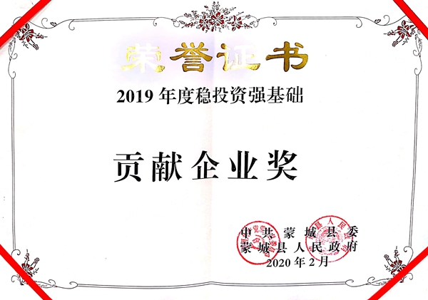 近日,蒙城縣委、縣政府印發(fā)了《關(guān)于2019年度全縣綜合考評結(jié)果的通報(bào)》文件,對2019年度對蒙城社會經(jīng)濟(jì)發(fā)展貢獻(xiàn)較大的單位進(jìn)行了表彰。公司榮獲蒙城縣穩(wěn)投資強(qiáng)基礎(chǔ)貢獻(xiàn)企業(yè)獎。