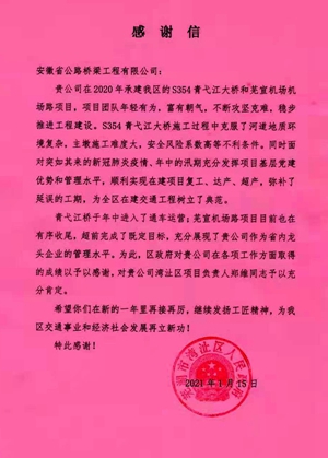 1月15日,蕪湖市灣沚區(qū)人民政府向安徽路橋公司發(fā)來感謝信,對公司順利完成青弋江橋和蕪宣機(jī)場路項(xiàng)目施工任務(wù)予以感謝。