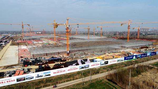 2月12日,農(nóng)歷大年初一,在舒城縣智慧電子小鎮(zhèn)EPC總承包項目施工現(xiàn)場,數(shù)百名工人正在進行廠房鋼筋幫扎、支架搭設(shè)。