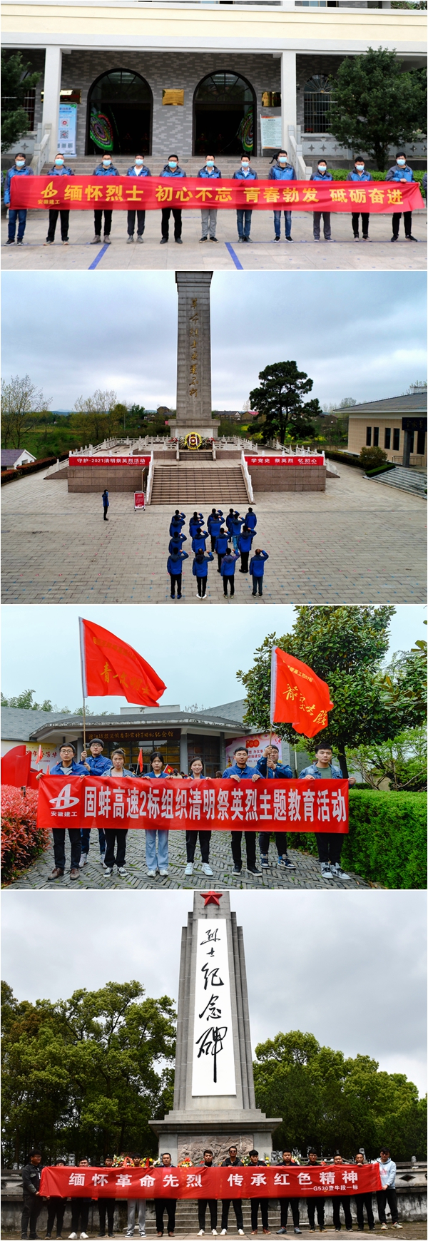 蒙城PPP項(xiàng)目黨支部組織黨員和職工來(lái)到蒙城縣革命烈士陵園掃墓祭奠,向革命烈士敬獻(xiàn)花籃,表達(dá)哀思;淮北片區(qū)黨支部組織黨員、團(tuán)員青年和職工瞻仰泗縣烈士陵園,銘記歷史,致敬革命先烈;合肥軌道交通3號(hào)線南延2標(biāo)項(xiàng)目黨支部前往新四軍江北指揮部開展黨史教育,重溫入黨誓詞,牢記初心使命;引江濟(jì)淮聯(lián)合黨支部追尋紅色足跡,在茶壺山烈士陵園紀(jì)念碑前,唱響國(guó)歌,靜思默哀;暢通二環(huán)(西南環(huán))項(xiàng)目黨支部組織開展“網(wǎng)上祭英烈”活動(dòng),廣大黨員、團(tuán)員青年和職工登陸網(wǎng)上紀(jì)念館,緬懷革命先烈,表達(dá)對(duì)英雄的敬意。