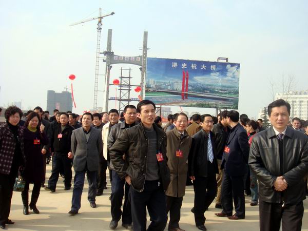 在大橋南端,代表委員們聽取了業(yè)主負(fù)責(zé)人六安市建委副主任曹德林關(guān)于大橋的相關(guān)介紹。當(dāng)曹主任介紹到自2009年2月1日開工以來,項目部緊緊圍繞工程目標(biāo),編排工期、制定方案,狠抓落實;全體員工凝心聚力、攻堅克難,確保各項目標(biāo)任務(wù)順利完成,預(yù)計4月初主跨即可合攏時,代表委員們不由地驚嘆起來。