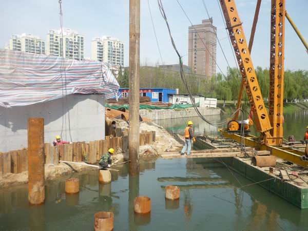 項目部自3月13日開打河中鋼管樁以來,克服了合肥市連續(xù)陰雨天氣和南淝河生態(tài)補水的影響,并努力克服了夜間不能作業(yè)的影響,在異常緊迫的工期壓力下,于4月初完成右半幅一百多根鋼管樁的打設(shè)作業(yè)。并在右半幅貝雷架架設(shè)完成后,開始進行左半幅鋼管樁的打設(shè)作業(yè)。目前河中鋼管樁和承臺鋼管樁打設(shè)已經(jīng)全部完成,下一步,項目部將進行左半幅滿堂架施工。