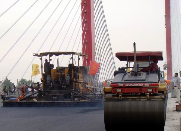 為了提高大橋橋面瀝青鋪裝質(zhì)量,在攤鋪前項目部組織200余名工人突擊清理橋面表面浮漿,待沖刷干凈并涂上防水層后,開始攤鋪瀝青。在攤鋪過程中全部使用自動攤鋪機和重型壓路機,使攤鋪、碾壓等工序科學(xué)合理、規(guī)范達標(biāo)。攤鋪施工剛一結(jié)束,黑亮寬敞而又整潔順暢的橋面就引來周邊過往市民的嘖嘖稱贊。