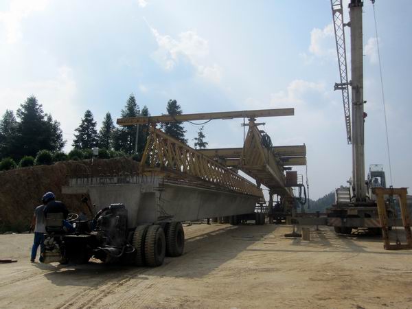為確保架梁施工安全,我部精心制訂施工方案。同時,在架梁機械驗收合格后多次對其進行檢查,對作業(yè)人員進行班前教育,做好交底,制定應急預案,保證了整個架梁過程安全、高效。隨著架橋機有節(jié)奏的完成一項項動作,襯墊、落勾、試吊、起吊、推進,在一串協(xié)調(diào)而又連貫的運作之后,金字牌大橋第一片梁板穩(wěn)穩(wěn)降落在它發(fā)揮作用的位置上。第一片梁的成功架設,拉開了我標段橋梁上部結構施工的序幕,為加快實現(xiàn)年度建設目標邁出了堅實的一步。