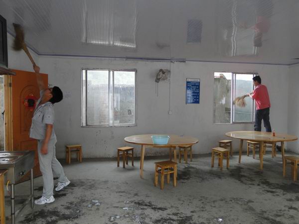 下午5點,按照先前的分工,各部門的團員都積極行動起來。試驗室負責(zé)餐廳生活區(qū),工程部、質(zhì)檢部負責(zé)宿舍樓,其余部門負責(zé)辦公走廊及前場活動區(qū)域的衛(wèi)生打掃。清洗桌子,擦洗門窗、打掃走廊,清理枯枝敗葉,經(jīng)過兩小時的辛勤勞動,整個項目部煥然一新。
